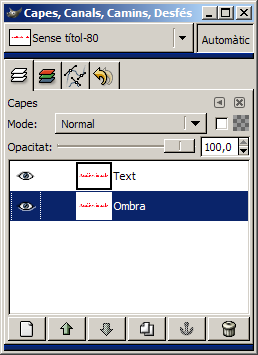 | En una imatge nova, escriviu un text. La nova capa de text la fusioneu amb el fons (Capes | Fusiona al capdavall), ara dupliqueu la capa (Capes | Duplica la capa) per tenir-ne dues d'iguals: una amb text i l'altra amb l'ombra. La capa Fons l'anomenareu Ombra i a la còpia de fons, Text, per entendre-ho millor. | ||||