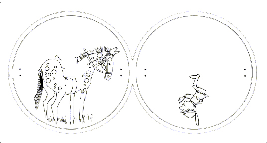 Per començar plantegem una pregunta: Per què veiem imatges en moviment ? Cal saber que el moviment no és altra cosa que una il.lusió òptica, un fenòmen que es produeix gràcies a l'anomenat principi de la persistència retiniana. Aquest principi diu que en desaparèixer un objecte de la nostra vista durant un espai mínim de temps, la seva imatge persisteix en la retina. Si passem un conjunt d'imatges consecutives, de forma ràpida, davant els nostres ulls, aquestes imatges s'unificaran creant la sensació de moviment. Aquest descobriment va generar, durant el segle XIX, un conjunt de joguines òptiques que es van posar molt de moda. Totes aquestes joguines (zootrop, taumatrop, praxinoscopi, etc) es basaven en la creació de seqüències de dibuixos que, mitjançant algun enginy òptic es veien en moviment. Proposem realitzar una d'aquestes joguines: EL TAUMATROP. Per realitzar el taumatrop necessitarem cartró, tisores, llapis, regle, cordill, retoladors. agulla. - En primer lloc dibuixarem sobre el cartró un cercle d'uns 3 o 4 cm de diàmetre. Hi farem una línia que divideixi el cercle per la meitat. Dibuixarem una altra línia perpendicular a la primera. Marcarem amb un llapis el punt on es creuen les dues perpendiculars i el foradarem amb una agulla. - Després retallem el cercle - En una de les cares del cercle hi dibuixem el cavall . En l'altra cara del cercle hi dibuixem la figura del nen indi. - Fem els forats amb l'agulla a cada cantó del cercle i després hi passarem un cordill. - Ja podem jugar amb el taumatrop. Fem girar el cercle subjectant els dos cordillets ben tibants.