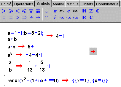 s'introdueix amb la icona Veurem de seguida com es poden efectuar les principals operacions: suma, producte, quocient i potències, i també constatarem el fet que es poden resoldre equacions polinòmiques amb coeficients complexos. Unes línies més avall teniu una foto d'una pantalla de treball amb la Wiris que podreu obrir efectivament si cliqueu a la icona de la fletxa. Us suggerim algunes exercitacions: