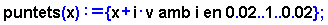 | Per dibuixar les línies de puntets que uneixen un vèrtex x amb el seu traslladat T(x) segons el vector v definim també una funció que depèn del punt d'origen x. D'aquesta manera, farem més lleugera la comanda dibuixa: | |