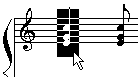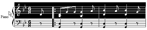 Per seleccionar un pentagrama situeu el punter del ratolí davant del pentagrama que voleu seleccionar, just a l'espai en blanc que hi ha entre el marge esquerra de la finestra i el començament del pentagrama. Feu clic una vegada i seleccionareu el pentagrama sencer en aquest sistema. Si feu doble clic seleccionareu el pentagrama que heu assenyalat en tots els sistemes, a partir del lloc on hagueu fet clic. (Imatge 3)