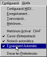 Com que aquesta peça no l'enregistrarem directament des d'un teclat MIDI, no necessitem tenir activat el metrònom, per tant podeu desmarcar l'opció Metrònom activat del menú Configuració.