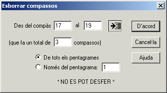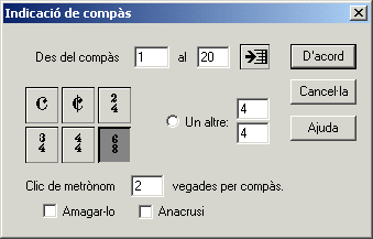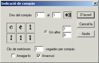 Observeu que l'operació de canviar la mètrica s'aplica a un rang determinat de compassos. En aquests moments segurament a la part superior de la finestra diu Des del compàs 1 al 1, i a nosaltres ens interessa que ho canviï a tota la peça. A la segona casella hauríem d'escriure el número del darrer compàs.