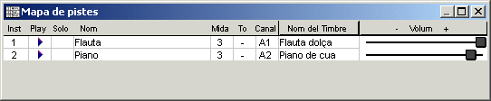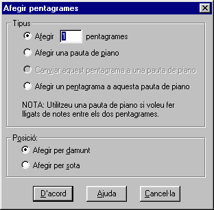Potser us preguntareu, per què no escollir l'opció Afegir un pentagrama a aquesta pauta de piano. Si escolliu aquesta opció, el Music Time afegeix un pentagrama però el manté en la mateixa pista que els altres i per tant ens obliga a utilitzar un únic timbre d'instrument. Amb l'opció que heu escollit, afegeix un nou pentagrama i una nova pista per aquest pentagrama. |