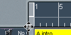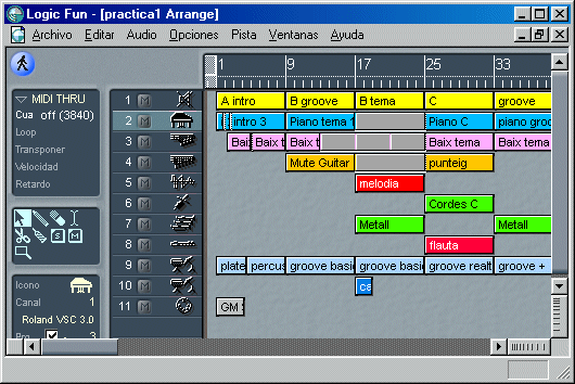 Amb el fitxer practica1.lso carregat, podeu veure a la pista 1, les seqüències "A intro", "B groove", i la resta d'entrades. A la columna de pistes, en la pista 1 apareix "No out" (sense sortida). Les seqüències d'aquesta pista muda només són marcadors per a les diferents parts del tema. A la resta de les pistes podeu trobar els instruments del tema de pràctica: piano, a la pista 2, baix, a la pista 3, guitarra, a la pista 4 i així successivament. El canal MIDI utilitzat per a cada pista està indicat en la columna de pistes, així com una icona representat a cada instrument. Si voleu modificar el tamany de les diferents parts que formen la finestra heu de situar el ratolí en la cantonada superior esquerra de l'àrea Arrange i quan el punter adopti forma de creu cliqueu i sense deixar anar arrossegueu el ratolí. (Imatge 7)