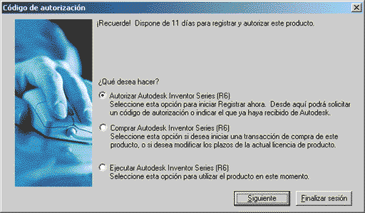 Per executar el programa, feu clic al botó Inicio|Programas|Mechanical Desktop 6|AutoCAD 2002 Esp i feu un clic amb el botó esquerre del ratolí. Si ho preferiu, podeu crear una icona d'accés directe a l'escriptori. Un cop iniciat el programa, s'obre en el vostre escriptori la finestra de l'AutoCAD 2002, i immediatament s'obre una finestra anomenada Código de autorización que us permetrà introduir el codi d'autorització que rebreu per correu electrònic si heu seguit els passos descrits ens els arxius d'ajuda a la instal.lació descrits a la Pràctica 1. Per començar ara a utilitzar l'AutoCAD 2002, trieu l'última opció i feu clic a Siguiente. |