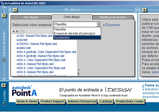 Feu clic al menú Archivo|Nuevo, i veureu com novament s'obre la finestra Actualidad de AutoCAD 2002; en aquesta ocasió, però, us serà útil i us permetrà utilitzar un assistent per crear un document personalitzat sobre el qual treballar. Per fer-ho, desplegueu la persiana Seleccione cómo empezar, i trieu l'opció Asistentes. |