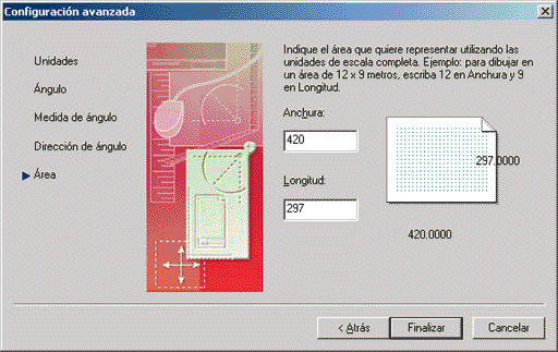 L'últim paràmetre defineix l'àrea de dibuix. Heu de donar una proporció, és a dir, una amplada, Anchura, per una alçada, Longitud, tot tenint en compte que aquestes mesures no són més que unes unitats anomenades per l'AutoCAD unitats de dibuix. Deixeu les mides per defecte, 420 d'amplada i 297 d'alçada, que corresponen en mil·límetres a les mides d'un DIN A3. |