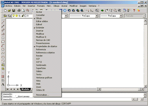 A la finestra principal teniu un nou document dins de l'entorn de barres d'eines i menús descrit a la Presentació dels elements de l'AutoCAD 2002. Podeu modificar parcialment aquest entorn, triant les barres d'eines que voleu tenir en pantalla. Per veure un llistat de totes les barres d'eines que hi ha per defecte a l'AutoCAD 2002, feu clic amb el botó dret del ratolí sobre un botó qualsevol d'una de les barres d'eines obertes actualment; els noms marcats amb un tic al costat corresponen a les barres d'eines obertes i els no marcats corresponen a barres d'eines tancades. |