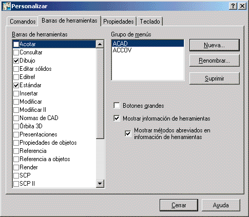 | Personalització de les barres d'eines de l'AutoCAD 2002 | |