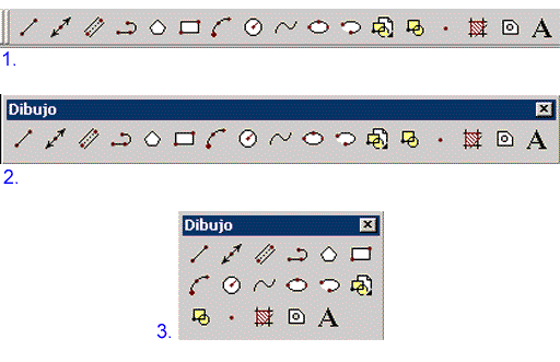 Qualsevol barra d'eines pot ser transformada en una capsa d'eines flotant. Per fer-ho, feu doble clic sobre el petit plec que trobareu a l'inici de la barra d'eines, i veureu que aquesta es "despenja" de sota la barra de menús o del lateral de l'espai de dibuix i es mostra com una capsa d'eines flotant. Aquestes capses d'eines, que mostren el seu nom a la barra de presentació, poden ser modificades en la seva geometria arrossegant qualsevol de les seves cantonades inferiors. Com a capses d'eines, poden tancar-se fent clic en el seu corresponent botó, Cerrar. Per retornar una capsa al seu aspecte de barra, arrossegueu-la per la barra de presentació cap al lloc on us interessi desar-la, o bé feu doble clic sobre la mateixa barra perquè es col·loqui com a barra a sota de la barra de menús. Comproveu els tres aspectes que pot tenir la barra d'eines Dibujo, tal com es mostra a la figura 14. |