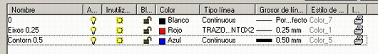 Tot objecte de l'AutoCAD consta d'una sèrie de propietats: Capa, Color, Tipo de línea i Grosor de línea. En dibuixar un objecte en una capa, rep les propietats d'aquesta capa, però això no vol dir que tots els objectes d'una capa tinguin les mateixes propietats, perquè es poden modificar de manera independent. |