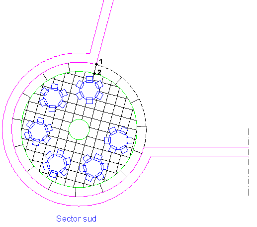 • Dibuixeu dos cercles de color verd, concèntrics amb els murs circulars, de radi 0,66 i 3,74 unitats respectivament.