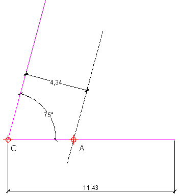 • Dibuix en la capa Auxiliar d'una paral·lela a la línia de 75º, a una distància de 4,34 unitats, amb la qual es determina el punt A. L'escala del tipus de línia és 0,05 unitats.