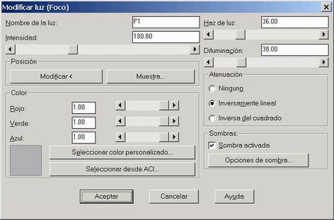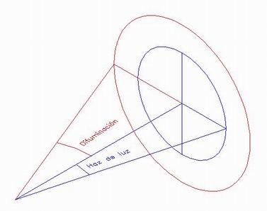| Difuminación: es refereix a l'angle total del con de llum, el brillant més el de penombra. Sempre ha de ser més gran que el valor que se li ha donat a Haz de luz. Si la diferència entre ells és molt poca es passa d'una zona molt il·luminada a la foscor immediatament, mentre que si els valors són més distants, hi haurà una zona de penombra apreciable. | |
