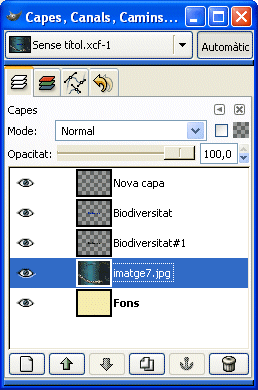 la darrera (les escombreries) serveix per eliminar una capa. Un altre aspecte a tenir en comte és que si deixem la pràctica a mig acabar i la desem en format gif, jpg, bmp,... o qualsevol altre que no sigui xcf (el propi del Gimp), quan recuperem la imatge ens haurà fussionat totes les capes i no podrem modificar-les. Per tant, si heu de deixar la pràctica inacabada per seguir més endavant, deseu-la en el format xcf (el propi del Gimp) i així mantindreu les capes.