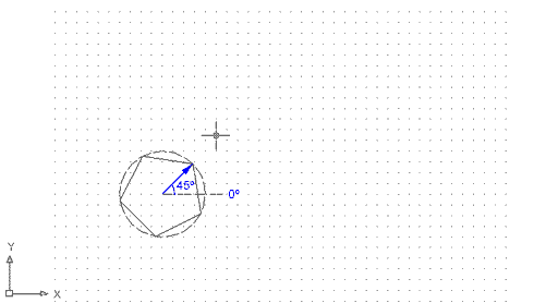 Esborreu el pentàgon anterior; com podeu comprovar, es tracta d'un únic objecte i no de cinc segments de línia independents. Repetiu la seqüència d'ordres anterior fins a arribar al pas 5. Quan el programa us demani Precise radio del círculo: introduïu una coordenada polar: per exemple, @40<45. Veureu que el polígon continua estant inscrit en una circumferència de 40 unitats de dibuix de radi, però que aquell costat parlal·lel a l'eix X ara ja no ho és. El programa ha calculat 45º d'inclinació entre el 0º -a l'est- i una línia virtual que passa pel centre i un vèrtex del polígon, tal com mostra la imatge següent. |