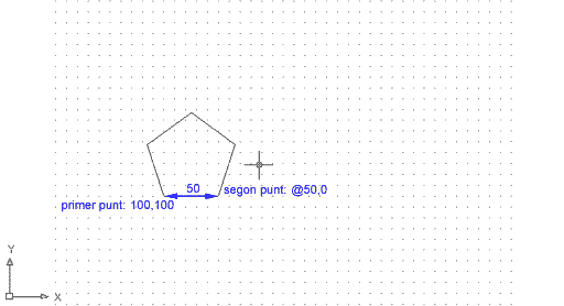 Naturalment, podeu definir la segona coordenada amb el sistema de coordenades polar, perquè la base del polígon tingui una inclinació determinada per vosaltres. Repetiu el procés anterior fins al pas 5, i quan el programa us demani Precise segundo punto final del lado: escriviu, per exemple, @50<45 i premeu la tecla de Retorn. Tindreu un pentàgon de costat 50 inclinat 45º respecte a 0º. |