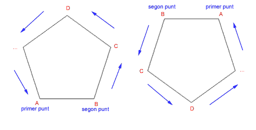 Com veieu, quan determineu un primer punt i un segon punt, el programa interpreta el tercer vèrtex, el quart, etc. del polígon en el sentit que heu fixat amb els primers dos punts. Així, tot i que les coordenades siguin les mateixes i els costats mesurin el mateix, l'ordre en què determineu els dos primers punts condiciona el resultat final. El funcionament seria aquest: |