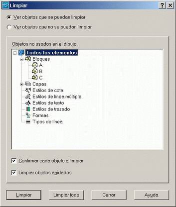 | L'única manera d'eliminar aquesta informació de blocs és mitjançant el comandament Limpia. Executeu-lo i s'obrirà el quadre de diàleg Limpiar que veieu a la figura 10. | |||
