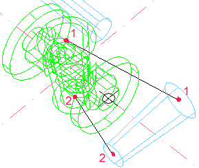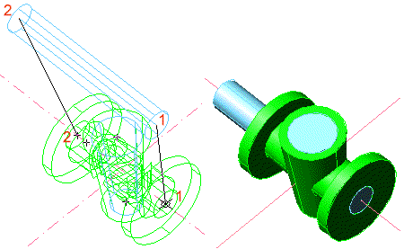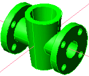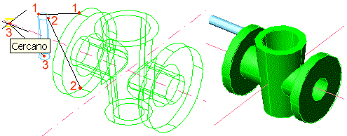 S'han de copiar per Simetría 3D els 4 cilindres blaus al costat de la dreta. La Simetría 3D utilitza un plànol definit per 3 punts, per fer la reflexió. En aquest cas, el plànol ques s'utilitza és paral·lel al YZ i passa pel centre del sòlid. Aquest punt de pas pot ser el centre o un quadrant de la part cònica del sòlid verd, com també qualsevol punt de l'eix vermell paral·lel a Y que passa pel sòlid. |