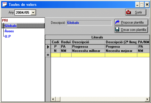 Definir les taules de valors per a primària |