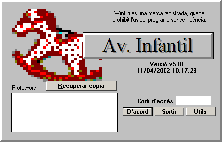 Per fer aquesta pràctica, heu d'instal·lar el Disc del Professor al mateix ordinador on teniu el programa WinPri. Heu de tenir en compte que per poder fer anar aquesta aplicació, és imprescindible que el programa WinPri estigui tancat. Aquesta circumstància difícilment es dóna a la pràctica diària d'una escola, ja que el procés d'avaluació sol fer-se als ordinadors de l'aula d'informàtica o bé en d'altres dependències, però mai al mateix ordinador de Secretaria. |