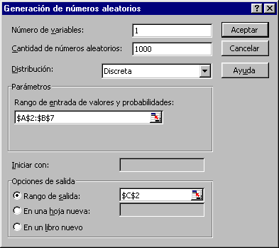 Per començar a fer simulacions, convé comentar que l'Excel incorpora una funció ALEATORIO que permet assignar valors aleatòriament a una o més cel·les, però si es fa servir aquesta funció, cada vegada que es recalcula canvien els valors aleatoris i aquest fet fa difícil seguir una construcció pas per pas. Per aquesta raó, s'aconsella, a l'hora de fer simulacions, l'opció Herramientas | Análisis de datos | Generación de números aleatorios. Tot seguit s'explica una manera de generar el gràfic que fa visual la llei empírica de l'atzar per al nombre de 6 observats quan es tira successivament un dau i s'aprofita per comentar altres aspectes. Llavors un dels exercicis que haureu d'enviar serà anàleg a aquest.