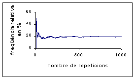Tot seguit s'explica com es pot fer el gràfic que mostra l'evolució de la freqüència relativa i permet constatar que a mesura que augmenta el nombre de tirades, la freqüència relativa s'estabilitza al voltant d'un nombre fix, 1/6 en aquest cas. La representació que fareu serà la d'una funció empírica: a l'eix de les x els nombres de tirades; a l'eix de les y les freqüències relatives. El gràfic més adequat és el següent: