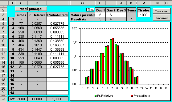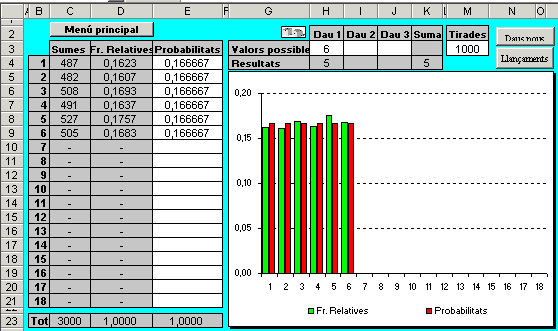 En aquest apartat us presentem una aplicació feta amb l'Excel que pot ser útil per fer simulacions de llançaments de daus i per visualitzar la llei dels grans nombres. Amb aquesta aplicació, l'usuari pot simular el llançament de fins a tres daus. Si es tria el llançament d'un sol dau, es pot analitzar el cas de les distribucions uniformes, en què tots els valors del dau tenen la mateixa probabilitat de sortir. Com que el dau pot tenir diferents casos possibles, pot servir també de suport i comprovació del càlcul de probabilitats per a diferents resultats teòrics. En el cas que es triï un màxim de dos resultats possibles per a un sol dau, es pot identificar la simulació amb el llançament d'una moneda. En el moment de fer servir més d'un dau, es veu que la suma dels diferents resultats dels daus ja no té un mateix comportament. Es pot analitzar, intuïtivament i gràfica, quins esdeveniments tenen més probabilitat de sortir, si hi ha esdeveniments amb igual probabilitat, quins són els menys probables, etc. També es pot comparar la probabilitat teòrica, calculada a part, amb la distribució de freqüències relatives.