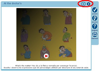 Click on 1: What's the matter? Fes clic a la fletxa vermella per començar l'exercici. Escolta i observa les expressions que els personatges utilitzen per descriure el seu estat de salut. Click on 2: What's the matter? Arrossega els textos fins a la vinyeta corresponent per completar la conversació. |