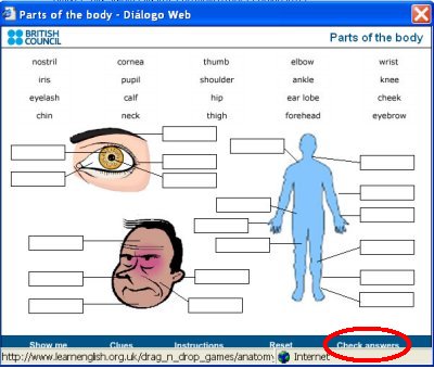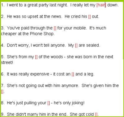 3. Now go to the old site and choose Body idioms. In this exercise, you must click on the blank between the brackets and type a part of the body to complete the idioms.