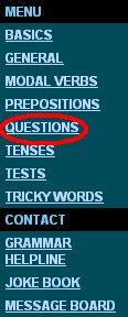 1. Go to http://www.autoenglish.org/freeexercises.htm. We're going to have a look at the different kinds of exercises available at this site. All the exercises are classified according to grammar topic. We'll start by doing some questions. Scroll down the page until you find the section, or choose Questions from the menu on the left hand side. |
