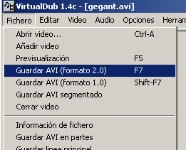6.- Un cop configurades les opcions, accepteu a totes les finestres i comenceu la codificació tot anant a Fichero/Guardar Avi (formato 2.0). A la versió en anglès del programa no apareix aquesta diferenciació entre els formats avi 1.0 i 2.0.