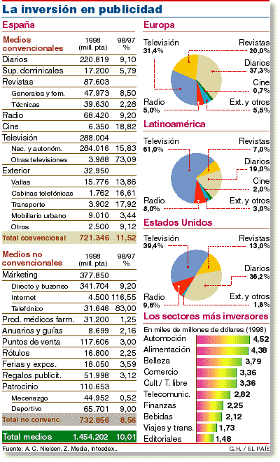Mireu també aquesta taula sobre les despeses d'alguns grans anunciants, difoses a El Anuario de El País 2001. A partir d'aquestes dades es poden fer una sèrie de reflexions sobre la importància que té la publicitat per als mitjans i la seva possible dependència del món empresarial, que és qui es troba al darrere de tanta inversió.