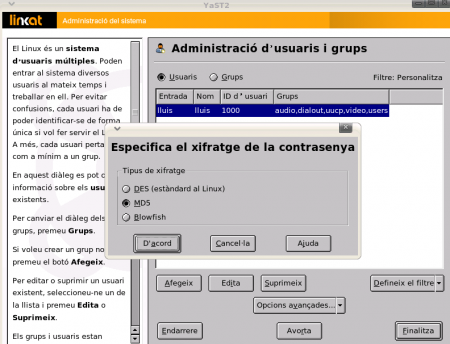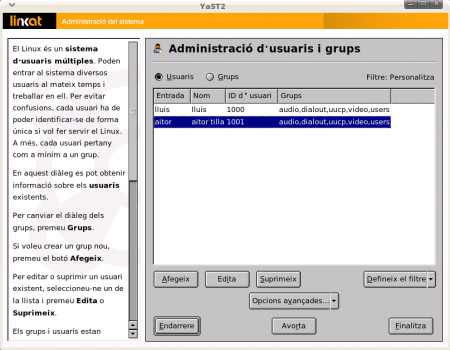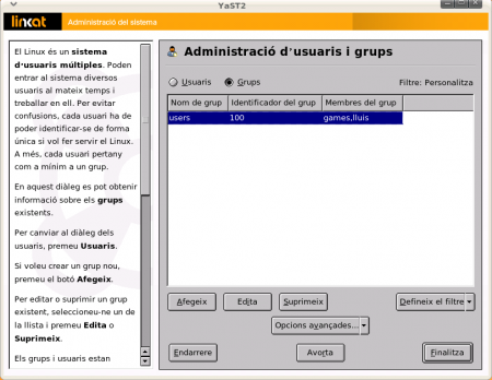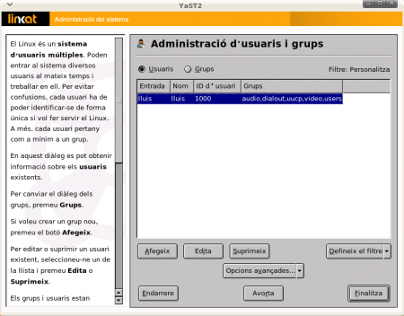 Un cop fets tots els canvis en la configuració d’usuaris i grups, aquests no tindran efecte fins que no premem el botó Finalitza en la finestra de gestió d’usuaris i grups. És per això que és bo fer pocs canvis i aplicar-los d’un en un, ja que si fem un canvi en l’administració d’usuaris que depèn d’un canvi previ que encara no hem aplicat ens pot donar resultats erronis.