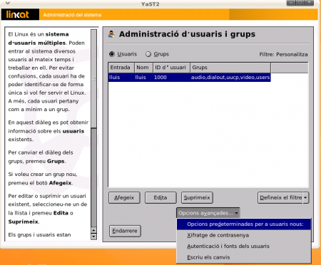 Per defecte, durant la instal·lació de la linkat heu creat un usuari a més del root o administrador. Per editar un usuari, cal que el seleccioneu de la llista i premeu el botó Edita: