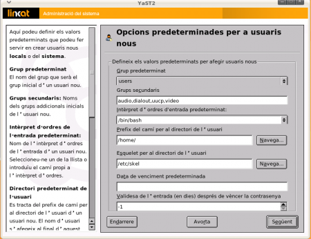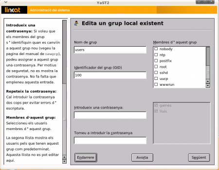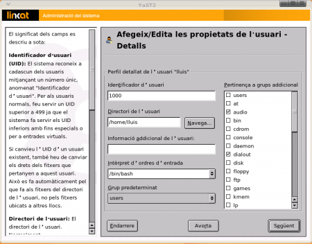 Qualsevol usuari pertany al grup users i això no es pot canviar, però sí podeu afegir-lo a d’altres grups. Si en crear un usuari nou, voleu que quedi inclòs en un altre grup, podem afegir el grup a la llista de Grups secundaris. També podem canviar l’Intèrpret d’ordres d’entrada predeterminat i el Prefix del camí per al directori de l’usuari.