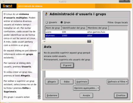 Per suprimir un grup d’usuaris cal seleccionar-lo de la llista i prémer el botó Suprimeix. Cal tenir en compte que no ens deixarà suprimir cap grup que tingui usuaris assignats.