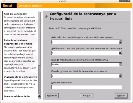 Podeu limitar el temps durant el qual aquest usuari pertanyerà al sistema. Posant una data al camp Data de venciment predeterminada, tots els usuaris que creeu no podran entrar a l’ordinador a partir d’aquesta data. Si ho deixeu en blanc, podran entrar-hi sempre.