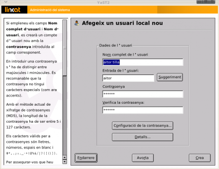 En la finestra que s’obre podeu escriure el nom i cognoms del nou usuari, assignar-li un identificador d’entrada que serà el que haurà d’escriure a la finestra d’entrada al GNOME, també es pot acceptar el suggeriment prement el botó Suggeriment.