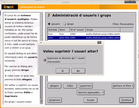 Per suprimir un usuari, el seleccioneu de la llista i prement el botó Suprimeix. S’obre una finestra de confirmació on haureu de dir si voleu que també s’esborri el directori de l’usuari.