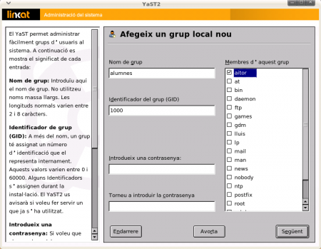 En aquest cas creareu un grup que anomenat alumnes i hi afegireu l’usuari aitor. Un cop assigants, premem el botó Següent.