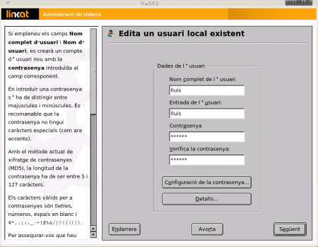 Com a mesura de seguretat, des d’aquí es pot posar límit de temps per tal d’obligar a l’usuari a canviar-la periòdicament. Premeu Següent. Per editar més propietats de l’usuari sel·leccionat, cal que premeu el botó Detalls. S’obre una finestra on hi ha diferents camps.