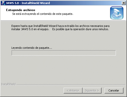 Aneu a l'adreça d'internet ftp://ftp.once.es/pub/utt/tiflosoftware/04_Revisor_Jaws/ i baixeu-vos el fitxer Jaws50_Esp.exe Executeu el fitxer Jaws50_Esp.exe que heu descarregat de la direcció web i seguiu les instruccions d'instal·lació. S'inicia el procés d'extracció d'arxius i la preparació de l'assistent d'instal·lació. |