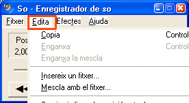 | La gravació que heu fet permet algunes modificacions. És útil poder suprimir els espais del fitxer que no tenen so, sobretot els del començament i del final de la gravació. Això es pot fer des del menú Fitxer de l'Enregistrador de so. | |||||||||||