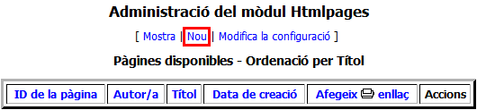 Des d’aquesta finestra, l’administrador/a pot crear noves pàgines estàtiques i editar i esborrar les existents. Inicialment, no hi ha cap pàgina, motiu pel qual la taula de pàgines HTML està buida.