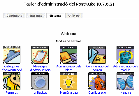 En aquesta pestanya trobareu accessos a les interfícies d’administració de mòduls essencials del PostNuke, com són la configuració dels blocs, dels mòduls, dels permisos i del Xanthia, entre d’altres. Així mateix, hi trobareu un accés al mòdul pnBackup, que permet crear i restaurar còpies de seguretat de la base de dades.