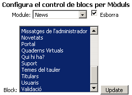 El menú de selecció múltiple conté un llistat de tots els blocs definits a la intranet, tant si es troben actius com inactius, i permet indicar sobre quin d’ells es desitja actuar. Per seleccionar-ne més d’un manteniu premuda la tecla de majúscules i feu clic sobre els noms dels blocs.