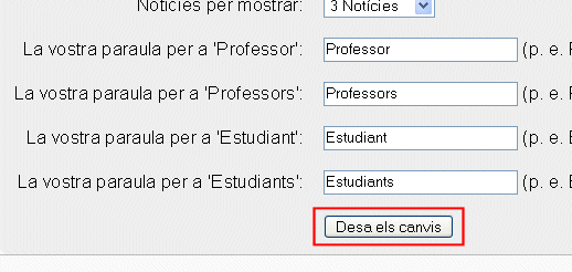 La resta de les opcions les podeu modificar segons el vostre criteri. Tingueu en compte que Moodle és un entorn de caire constructivista i potser en alguns moments serà convenient anomenar el professorat amb un altre nom com per exemple: col·laborador/a, assessor/a ...